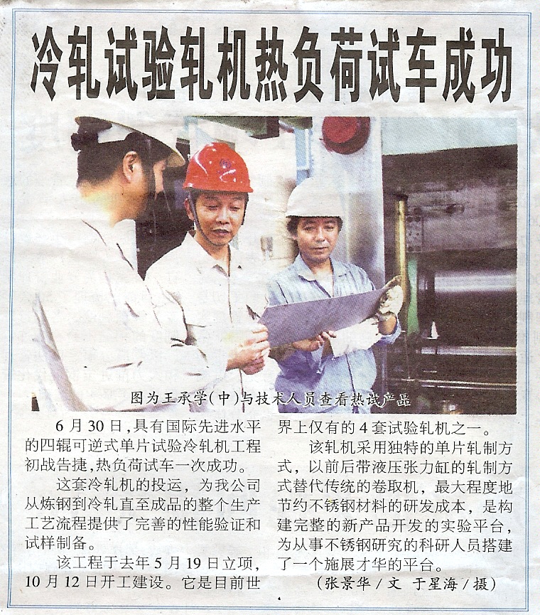 据宝钢股份不锈钢分公司“不锈简讯”报道,2006630日,具有国际先进水平的四辊可逆式单片试验轧机工程初战告捷,冷轧试验轧机热负荷试车一次成功。此项工程项目“宝钢股份不锈钢分公司450直拉式可逆冷轧试验轧机”是由东北大学RAL承担的。该工程于20055月立项,它是目前世界上仅有的4套试验轧机之一,也是国内第一套。