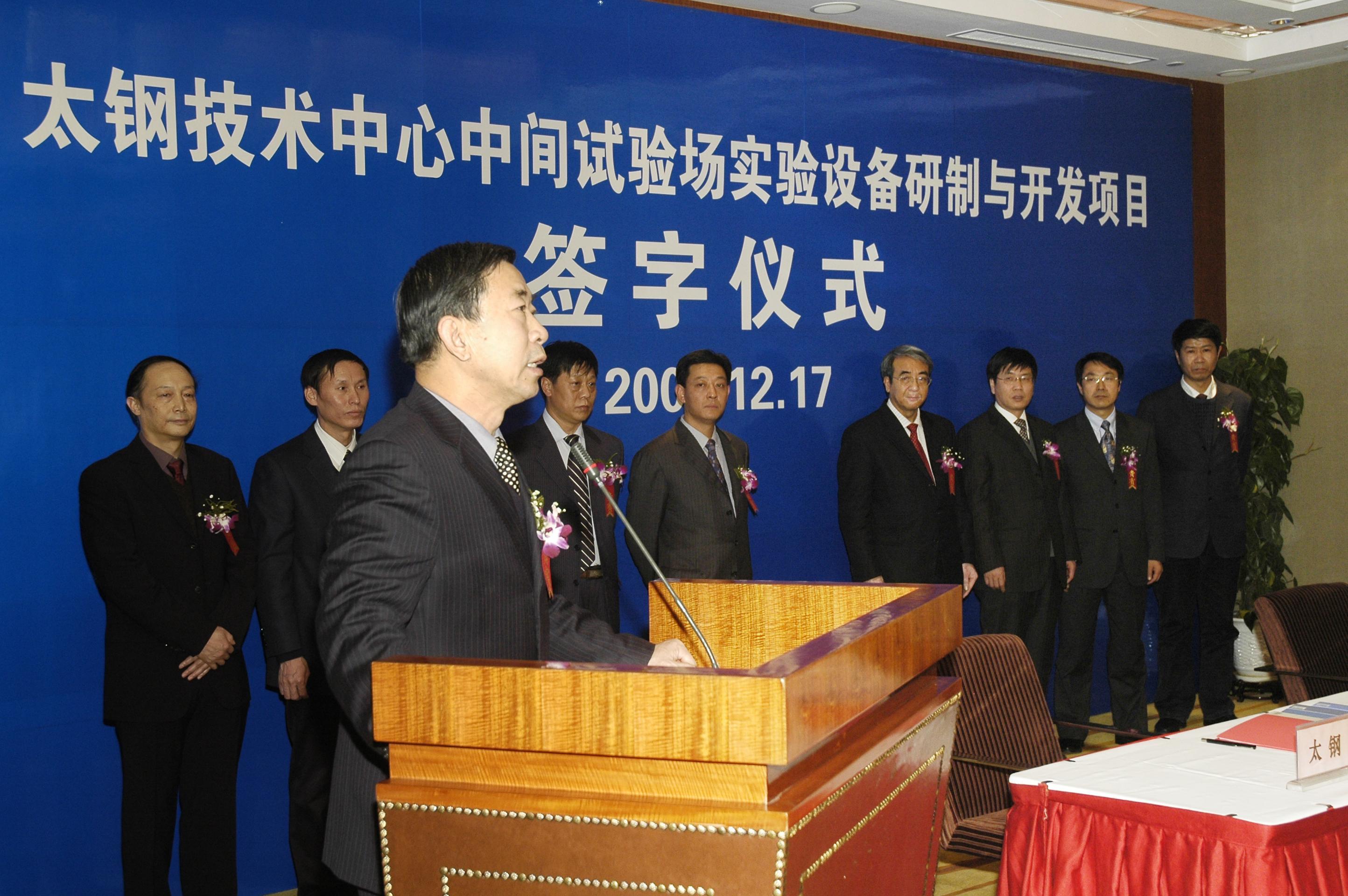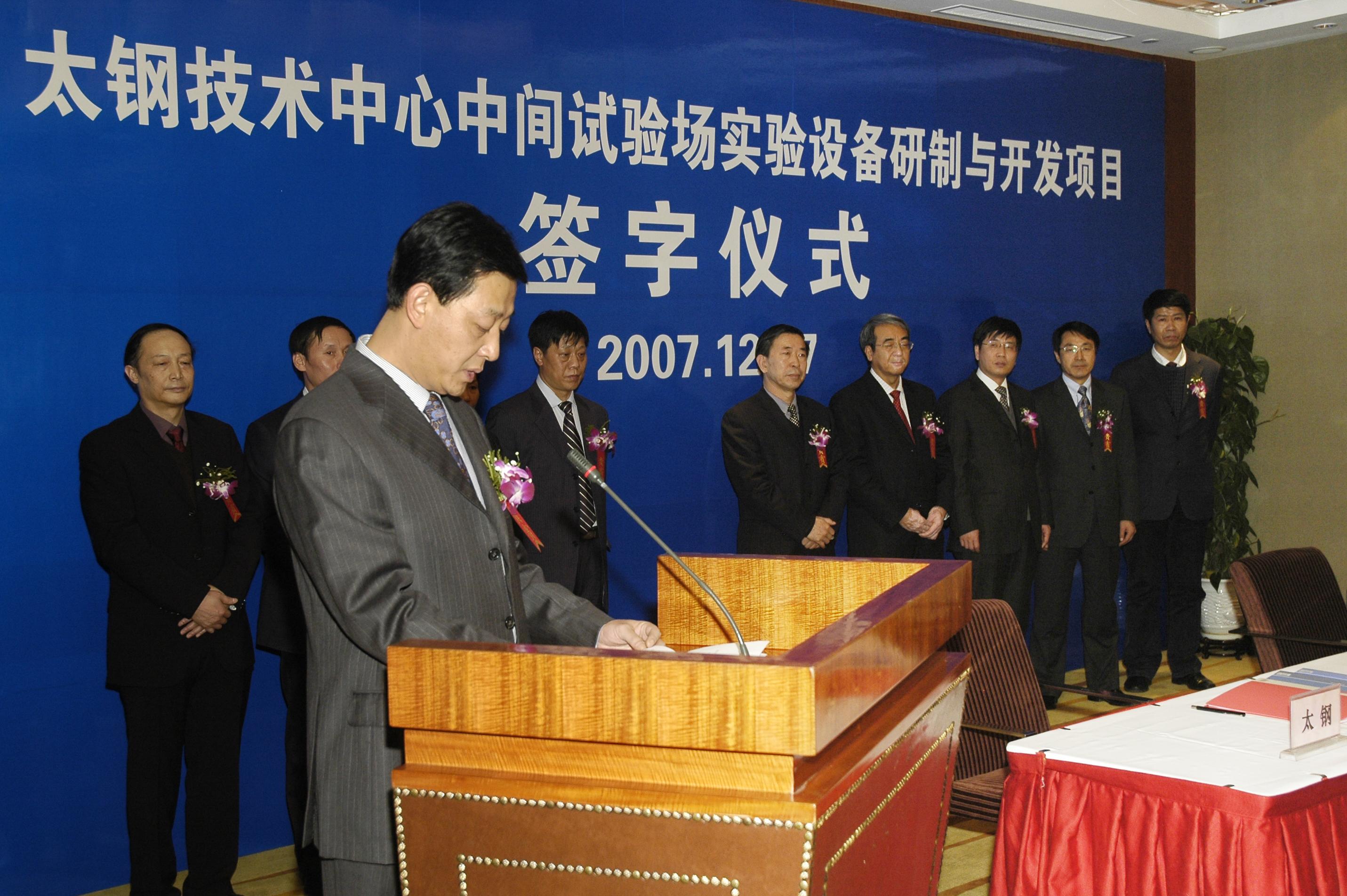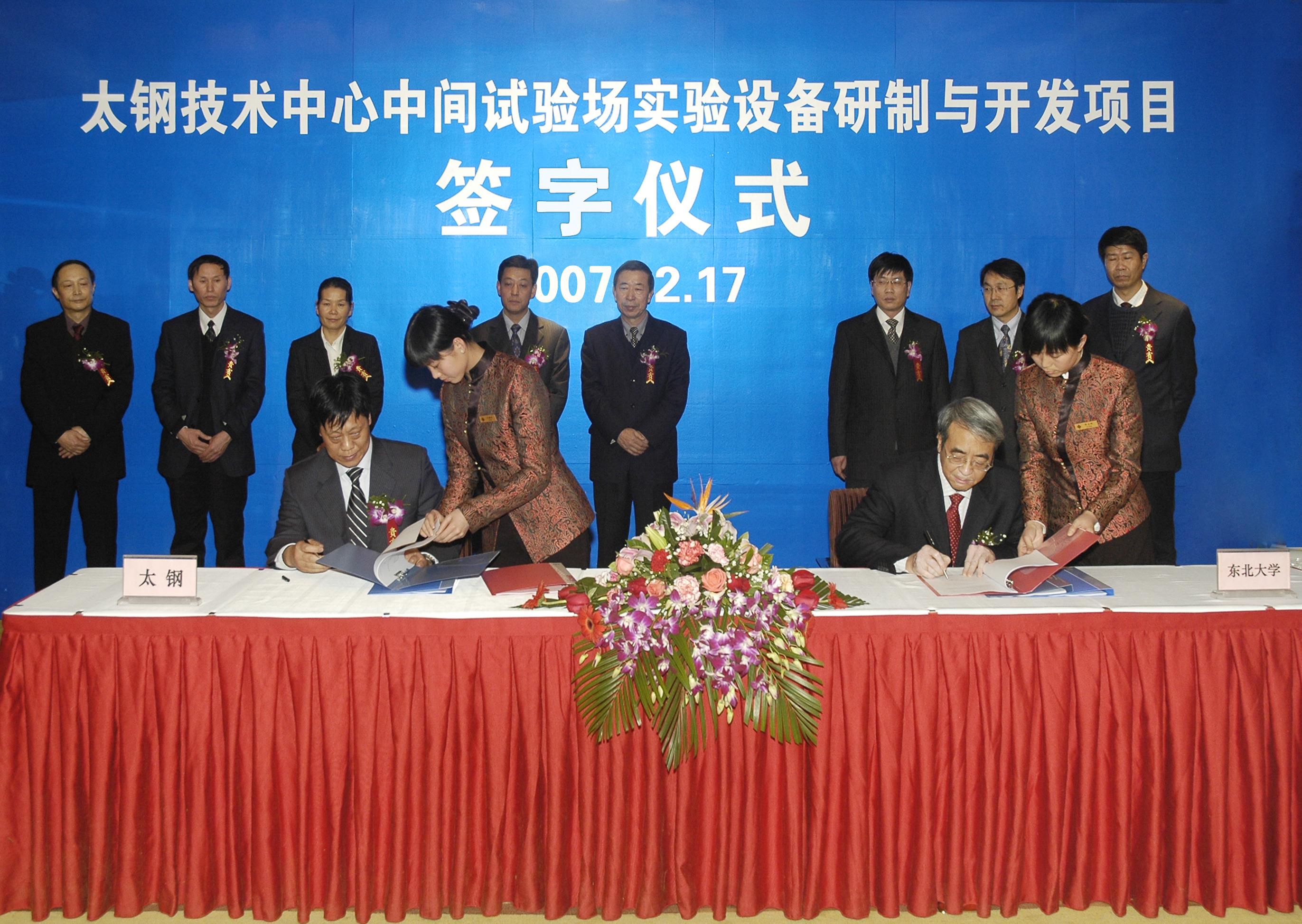 2007年12月17日下午,东北大学与太原钢铁集团有限公司太钢技术中心中间试验场实验设备研制与开发项目签字仪式在太原花园国际大酒店三楼会议室举行。东北大学副校长王宛山教授、RAL主任刘相华教授、太钢集团胡玉亭总工程师、太钢技术中心王立新主任以及东北大学和太钢相关部门领导等出席了签字仪式。仪式中,东北大学王宛山副校长和太钢胡玉亭总工程师分别就双方科技合作事宜作了重要讲话。项目签字仪式在友好、热烈的气氛中进行。