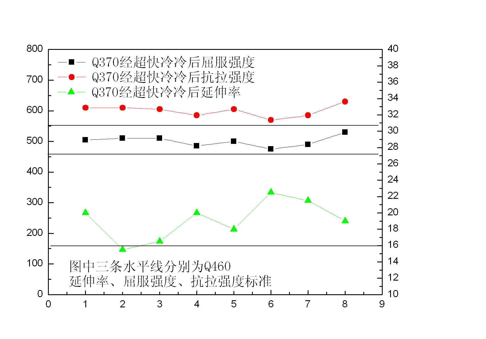 继续降低超快冷终冷温度(终冷温度低于600℃),性能测试结果表明, Q370q成分的钢板的性能可以满足Q460的供货标准。