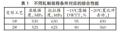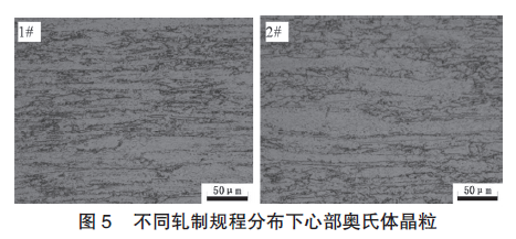 由图5可见,第1#轧制规程分布下钢板心部的奥氏体晶粒明显比第2#轧制规程下钢板更扁更均匀。两种轧制工艺对应的综合性能见表1。