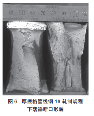 从表1可见,第1#轧制规程分布条件下钢板的综合性能明显比第2#轧制工艺条件下更优异,尤其是-15℃落锤性能。1#规程下落锤断口如图6所示。