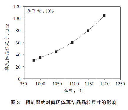 粗轧温度对于再结晶动力学和再结晶晶粒尺寸均具有较大影响,提高粗轧温度会加快再结晶过程,有利于获得均匀的奥氏体,但同时会增大再结晶晶粒尺寸和道次间隔中的长大速度,不利于晶粒细化。因此需要通过试验研究找到较好的粗轧温度,以获得充分细化的奥氏体晶粒。