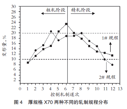 粗轧和精轧阶段合理的轧制规程分布可明显细化钢板心部奥氏体的晶粒尺寸,提高厚规格管线钢的综合性能。本文对比了两种不同的轧制规程对32mm厚规格X70管线钢心部奥氏体晶粒细化的影响,并对比了其综合力学性能。两种不同的轧制规程分布,主要体现在粗轧最后一道次和精轧最后一道次的压下率,见图4所示。