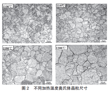 为改善高钢级、厚规格管线钢的低温韧性,必须在发生针状铁素体相变之前,通过优化加热工艺最大限度地细化原始奥氏体晶粒尺寸。在实验室采用热模拟方法,将试样以10℃/s的速度加热,加热温度分别为1100℃、1140℃、1180℃和1200℃,保温时间10min后水淬,观察试样的原始奥氏体晶粒尺寸如图2所示。