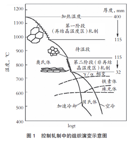 控制轧制是一种控制变形温度和变形量,细化奥氏体晶粒尺寸的热变形制度,可使钢的奥氏体晶粒尺寸得到显著细化,组织结构得到控制,从而使钢材具有优良的综合性能。通常把控制轧制分为两个阶段,如图1所示。