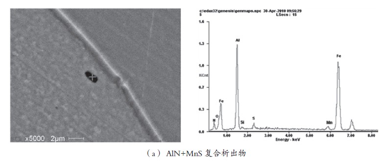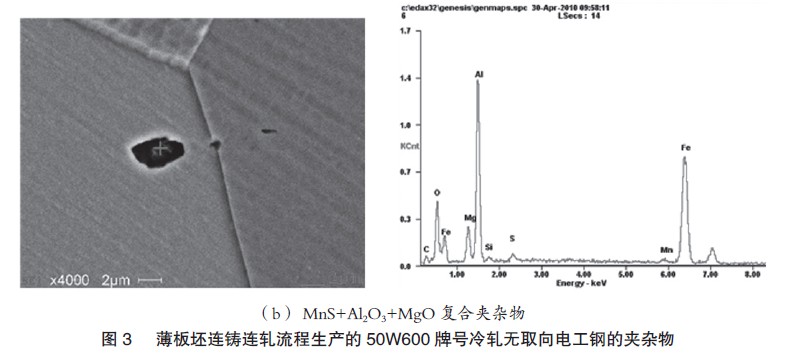 薄板坯连铸连轧流程生产50W600牌号无取向电工钢成品退火板的析出物主要为AlN+MnS的复合析出物,多为条棒状,尺寸在2μm左右,其形貌及能谱如图3(a)所示。退火板中还发现少量MnS+Al2O3+MgO复合夹杂物,呈不规则多边形,尺寸在3μm左右,如图3(b)所示。