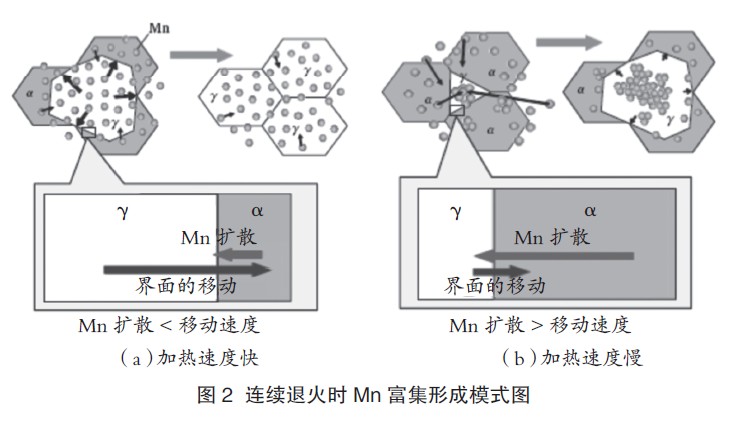 当温度升高,相变开始由铁素体向奥氏体转变时,铁素体中的Mn会扩散到奥氏体中。此时,如果奥氏体的相变速度(铁素体-奥氏体界面的移动速度)快时,在相变进行中就不会出现Mn从铁素体扩散到奥氏体中的现象(图2(a))。另一方面,当加热速度慢时,不仅Mn的扩散距离增大,而且界面的移动速度缓慢,结果会促进Mn扩散到奥氏体中(图2(b))。在本研究的实验结果中,只有在加热速度慢的情况下,才能观察到Mn的富集,可以认为就是这个原因所致。但是,由于本研究的试验用钢含有Nb,因此组织细化。与组织没有发生细化的情况下相比,Mn从铁素体向奥氏体的扩散距离变短,可能有助于Mn形成富集,这是今后的研究课题。