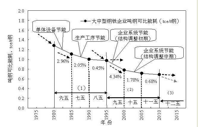 由图2可见,中国钢铁工业自1980年开展节能工作以来,30年间吨钢能耗曲线曾出现两次周期性变化,每次15年。两条吨钢能耗曲线形状相似,下降规律相同:前5年,能耗曲线下降最快,年均节能率最大;中间5年,随着吨钢能耗的逐年降低能耗曲线变缓,年均节能率减小;后5年,曲线变得更为平缓。例如,在“六五”时期,由于当时各生产工序的基础能耗较高,所以最初实施单体设备节能的效果明显,年均节能率达2.96%;到了“七五”时期,继续降低工序能耗的直接节能效果变差,年均节能率减小到2.05%,进入“八五”时期就更低了,只有0.45%;“九五”期间,中国钢铁工业从单体设备节能扩展到系统节能,通过生产结构调整和工艺流程优化等措施,使得中国吨钢能耗第二次出现大幅度下降走势,年均节能率上升到4.34%;到了“十五”时期,随着生产结构的逐渐改善和各工序钢比系数的逐年降低,间接节能效果在不断减弱,年均节能率再次回落到1.78%;到2010年底,“十一五”期间的年均节能率只有0.68%。