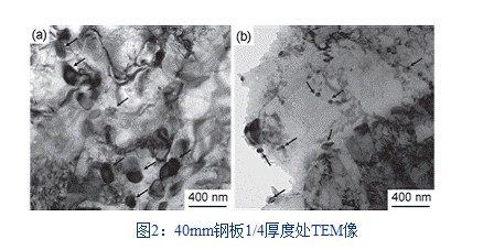 表1为开发船板EH40的成分,属低碳当量设计。40mm厚轧板的1/4和1/2板厚处的金相组织,主要由针状铁素体构成。图2为板厚1/4处的透射电子像,观察到大量尺寸在30-200nm之间的氧化物粒子(箭头所示),EDS数据显示该类粒子为含Ti、Mg的复合氧化物粒子,经统计该类粒子的面密度≥4×106个/mm2。表2为钢板的拉伸性能和冲击性能,满足船级社对EH40级别钢种的性能要求。