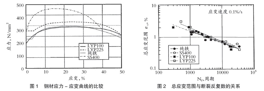 图1是低屈服点钢和普通钢SS400的应力-应变关系。低屈服点钢与SS400比较,屈服点低1/4-1/3,具有超过50%的大延展性能。低屈服点钢的低周期疲劳特性与普通钢相同(图2)。
