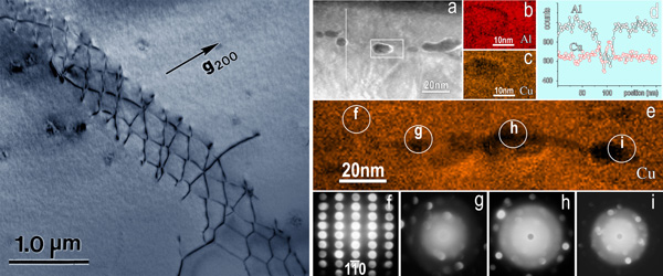 Al2Cu析出相中典型的位错组态之一(左图)以及经严重变形后(110)滑移面上的成分和结构信息(右图)。位错在具有四方点阵结构的Al2Cu相中具有多个独立的滑移系,上图(右)给出的信息对应于(110)[001]滑移系的情况。 (上面右图中各部分显微图像对应的成像条件详见全文及其附件)