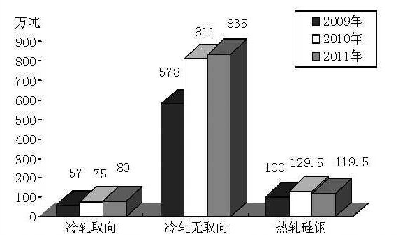 目前,我国电工钢表观消费量为783.35万吨,其中冷轧无取向电工钢表观消费量为601.49万吨,取向电工钢表观消费量为91.92万吨(不含二次油片数量),是世界最大的电工钢生产和消费国(2009年~2011年我国电工钢表观消费情况见图2)。从产量看,我国冷轧电工钢完全可以满足国内机电行业和家电行业的需求;从产品质量上看,冷轧电工钢具有技术先进、产品节能、使用自动化程度高等优势,为加快淘汰热轧硅钢奠定了基础。我国冷轧电工钢生产的国产化技术和装备水平、品种档次、磁性能指标均接近世界先进水平。例如,国产冷轧电工钢连续脱碳退火线、二十辊可逆式轧机、涂层机组、在线测试仪及电控、自动化等核心装备或仪器已成功在国内使用,我国大型水电、火电发电机组和大型、特高压变压器已成功使用了国产高牌号无取向电工钢和HiB钢。