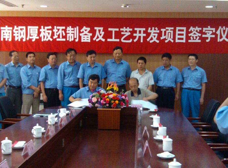 南钢公司总经理吕鹏、副总经理蒋筱春、姚永宽等公司领导出席签字仪式,4700工程副总指挥蒋国永主持签字仪式,我室王国栋院士与南京钢铁股份有限公司姚永宽副总经理共同签署了项目合同。吕鹏总经理在讲话中回顾了双方的合作历程和取得的成果,并指出,这一项目是南钢科技创新、转型发展、突出特色的重要项目,对南钢4700轧机投产后发挥效能、开拓新的领域具有重要意义,希望双方紧密合作,保证质量和工期,为南钢的可持续发展做贡献。王国栋院士在讲话中表示,继3500热处理生产线淬火机项目、2800中厚板轧机超快冷系统项目、4700中厚板轧机超快冷项目后,RAL又承担了南钢这一新的建设项目,这标志着南钢和RAL的合作又进入了一个新的阶段。RAL要珍惜南钢提供的这样一个机会,竭尽全力,优质高效完成工程项目,为南钢的可持续发展贡献力量。