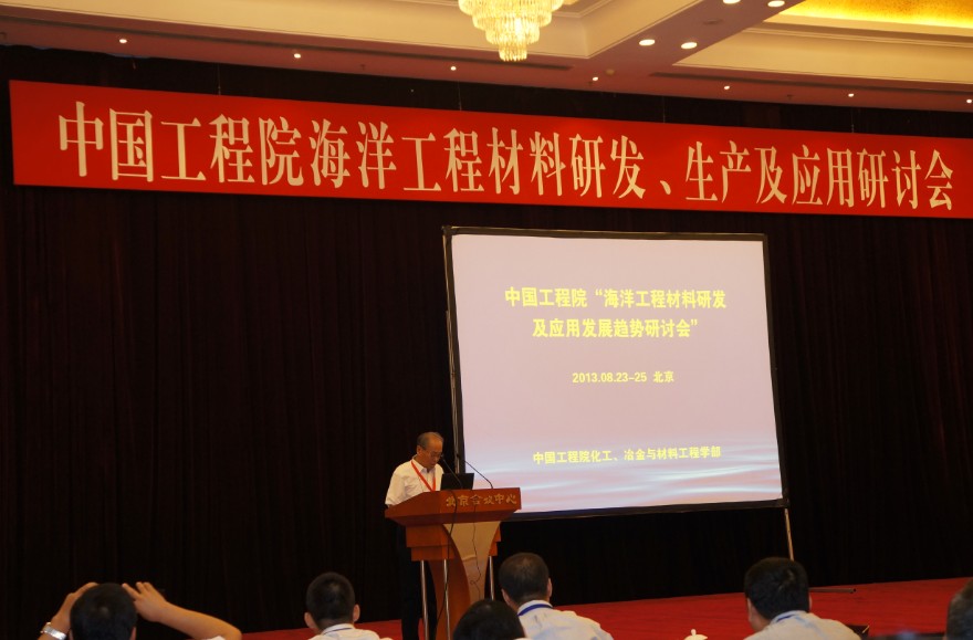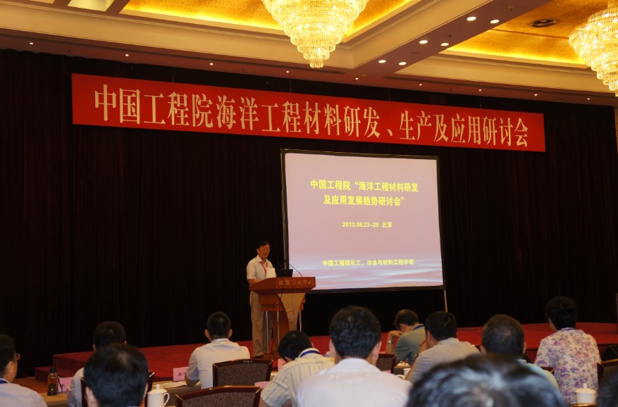 中国工程院“海洋工程材料研发、生产及应用研讨会”于2013年8月23—25日在北京会议中心举行,干勇院士,周廉院士、翁宇庆院士、陈蕴博院士、李鹤林院士、王国栋院士、张金麟院士、高从堦院士到会,来自全国各地的相关领域专家、学者和本项目组成员共计二百多人参加了研讨会,会议由翁宇庆院士主持。