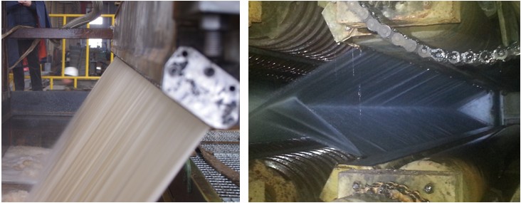 中厚板淬火工艺的核心在于开发出具有高强度冷却能力且冷却介质流量分布合理的淬火系统喷嘴结构。辊式淬火机淬火系统的核心是狭缝式喷嘴。原引进淬火机缝隙喷嘴为隔板分腔结构,且长度方向上变形严重,总变形量为10~15mm,且无法矫正恢复原始精度,整套淬火系统喷嘴已无法满足薄规格板材高均匀性淬火的需求。东北大学研发的具有自主知识产权的超宽整体狭缝式喷嘴结构,通过多重阻尼系统实现钢板宽度方向射流速度的高均匀性分布。喷嘴中试试水照片及现场实际射流效果如图1所示。