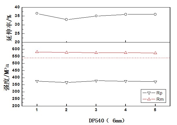 以6mm DP540钢卷取样,板宽方向性能情况如下图所示: