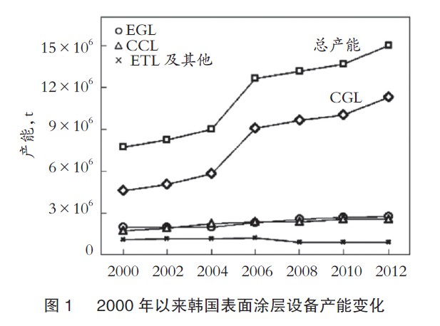 在韩国,首条连续热浸镀锌生产线由联合钢铁公司在1967年建成,此后经过20世纪80年代和90年代的发展,连续镀锌和彩涂线的产能突破300万t,自2000年以来产能快速增长,见图1。不包括钢卷彩涂线(CCL)的产能之外的以产品为基础的总产能,2012年超过1500万t,这是韩国国内75条生产线的产能。韩国之外还有19条生产线,产能为360万t。