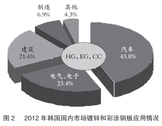 2012年,韩国产量预计约为1200万t,其中60% HG(热浸镀锌钢板)、15% EG(电镀锌)、18% CC(彩涂),其他占7%。市场比例从大到小顺序为汽车、电气电子、建筑和其他,见图2。HG的主要市场是汽车行业(67.5%)、EG的主要市场是电气和电子(60.9%)、CC主要市场为建筑(52.1%)。GA(合金化镀锌钢板)作为汽车钢板,主要由POSCO和现代海斯克公司生产,2012它们的GA产量超过GI(镀锌钢板)。Zn-55%Al镀层钢板广泛应用在房屋和建筑行业,2012年联合钢铁、东部制钢等公司共生产超过120万t这类镀层钢板。POSCO C&C和东部制钢公司生产50万t镀铝钢板。此外,POSCO开发并从2012年开始在新建的热浸镀生产线上生产Zn-Mg-Al镀层钢板。