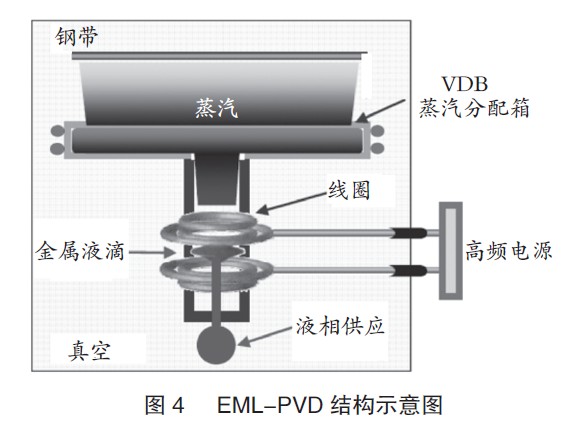 最近,POSCO也建造了一座新型PVD中试线,可加工1550mm钢带。这条中试线配有新开发的EML-PVD(电磁悬浮物理气相沉积)工艺,见图4。为了克服传统PVD工艺的缺点和低电镀效率,专门设计EML-PVD腔。将在这条中试线开发具有优异抗腐蚀性能的新型Zn-Mg镀层,这将是应用于各种领域的有前景的材料。