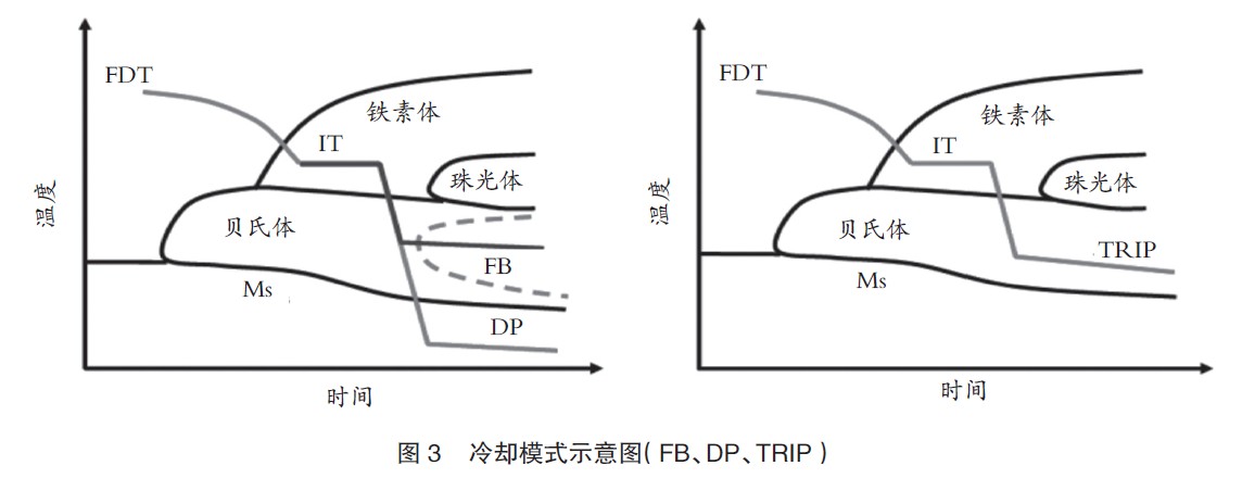 为了实现热轧DP、FB(铁素体贝氏体)和TRIP钢的力学性能,需要优化化学成分、热轧带钢厂的轧制工艺和带钢输出辊道(ROT)上的冷却速率。图3给出示意性冷却过程,可以看出热轧过程在Ar3温度点以上完成,接着在两阶段冷却模式下控制冷却。
