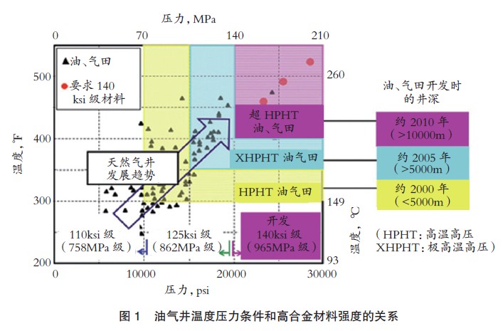 为满足世界能源需求的增长,天然气产量不断增加,天然气开发生产环境不断向高温高压的方向发展(见图1)。近年来开始开发超高温高压环境(Ultra HPHT,地层压力20000(138MPa)以上、地层温度400℉(204℃)以上)天然气气田。传统的高合金油井管的强度是0.2%屈服强度(YS)110ksi(758MPa)以上和125ksi(862MPa)以上。但超高温高压天然气气田开发需要耐高内压和高耐蚀性的、YS在140ksi (965MPa)以上的油井管。新日铁住金对高强度Ni合金油井管进行开发研究。合金的成分系为25%Cr-32%Ni-3%Mo。