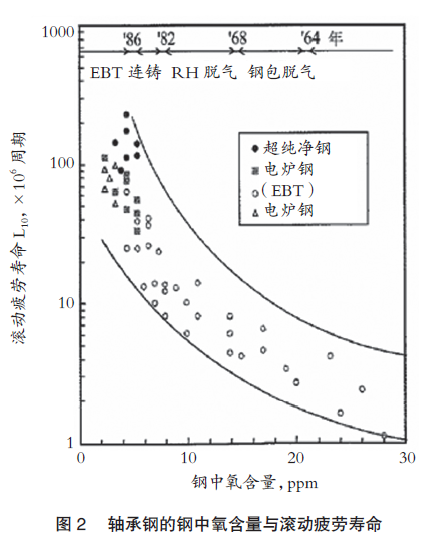 在上述工序中,山阳特钢为防止电炉熔化的钢污染,采用偏心炉底出钢(EBT)流到钢包。在下一钢包精炼(LF)工序,进行脱硫和去除氧化物夹杂物。在RH脱气工序去除氢和氧的气体成分后,在与外气隔断的状态将纯净化的钢水浇铸到大断面垂直连铸机,促进夹杂物上浮去除后,获得超高纯净度的轴承钢铸坯。铸坯经过均热扩散处理(均热)、轧制、锻造加工,加工成棒钢、钢管和热锻造品等。然后,通过球化退火处理-切削、冷加工-淬火+回火获得适当碳化物分散和希望的硬度,精加工后加工成轴承制品。提高轴承钢性能的历史是降低氧化物夹杂物,即降低氧含量的历史,见图1。从图中可知,由于过去几十年精炼方法的发展和降低氧含量措施,轴承钢中的氧含量减少到几个ppm,滚动疲劳寿命也提高了几十倍。