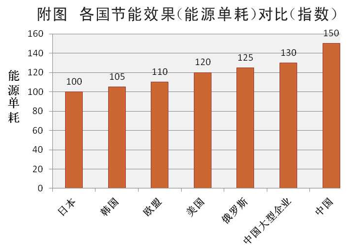 从节能效果比较来看(见附图),以日本钢铁企业能源单耗100为基础指数计算的数据进行分析,韩国钢铁企业能源单耗为105,略大于日本,欧洲为110,中国大中型钢铁企业为130,全行业则为150,这说明中国钢铁企业吨钢能耗是日本的1.5倍,中国与日韩企业在节能上还存在较大的差距[数据来自International Journal of Material Research(《国际材料研究学报》)]。