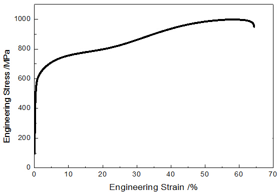 我室在双相不锈钢研发方面具有雄厚、坚实的基础。刘振宇教授带领的研究小组已经在实验室条件下研发出冷轧薄规格、节约型双相不锈钢薄带的制备技术。研究结果表明,该技术不仅大幅度提高成材率,而且将钢中氮含量提高至0.4%左右。21%Cr-5%Mn-0.4%N双相不锈钢的拉伸曲线表明,原型钢的强塑积高达62000MPa%以上。