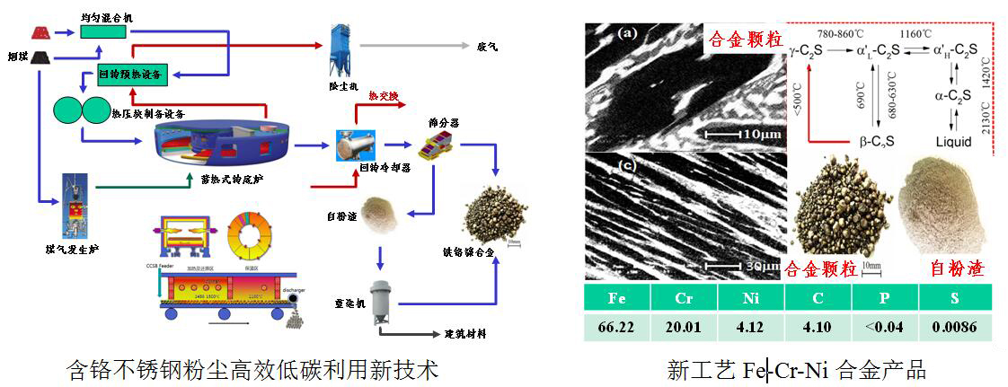 不锈钢粉尘是含30% Fe、8-15%Cr、1-9%Ni的典型难处理炼钢二次资源,产生量大(吨钢约18~33kg),被划分为危险工业废弃物。现有不锈钢粉尘综合利用技术工艺复杂,Cr回收率低,能耗高。因此,基于环境污染和镍铬资源对外依存度高的大背景,研发含铬不锈钢粉尘高效利用新技术对钢铁产业可持续发展和绿色化具有重大意义。