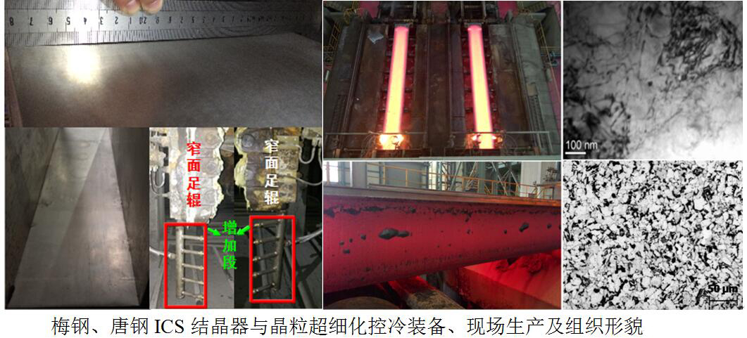 (2)成功研发可满足多钢种浇注与在线调宽功能的新型内凸型曲面锥度结晶器(ICS)装备与工艺技术,实现了结晶器内铸坯角部冷却速度达10℃/s以上的快速冷却目标,有效细化铸坯角部组织一次凝固晶粒,并成功解决了微合金碳氮化物晶界大尺寸析出控制难题。