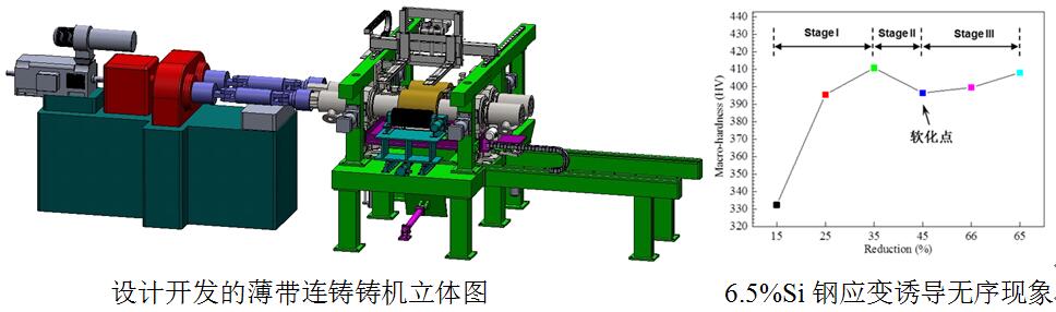 在2011协同创新中心于2015年首次明确了6.5%Si钢形变诱导无序化的金属学原理,突破了薄带连铸6.5%Si钢的轧制成形关键工艺技术,实验室条件下实现了无取向6.5%Si钢薄带的高效冷轧,为武钢国家硅钢中心设计开发了薄带连铸铸机。取得的主要创新性结果如下: