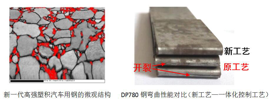 所开发的高强度配分钢是一种非常适合在现有冶炼、连铸、轧制和热处理工艺下开发的全新汽车钢品种,具有广阔的应用前景。热轧-冷轧-连续退火一体化控制方法正在首钢进行工业化应用。针对高强、超高强双相钢及低合金高强钢等汽车用钢主要品种,该方法通过对各工序工艺参数的控制,实现对铁素体再结晶、相变及析出等物理冶金学行为的调控,实现强塑性和成形性能匹配。