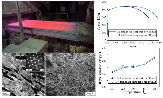 随着海洋平台构建向大型化发展,对装备的安全性提出更高的要求,尤其是深海极地海洋平台用钢需要超高强度、优异低温韧性的特厚板。先进常规流程热轧工艺与装备技术方向刘浩硕士研究生围绕海洋平台用超高强特厚板组织性能均匀化控制,通过合金成分设计、热力学计算及控轧控冷实验,创新提出以Mn/C替代昂贵的Ni-Mo合金化成分设计思路,采用热轧后在线淬火、两相区回火工艺,开发的海洋平台用80mm厚高组织均匀性低碳中锰高强韧特厚板,屈服强度≥770MPa、屈强比≤0.88、延伸率≥25%,-60℃冲击功≥165J,综合力学性能满足Q690F国家标准。