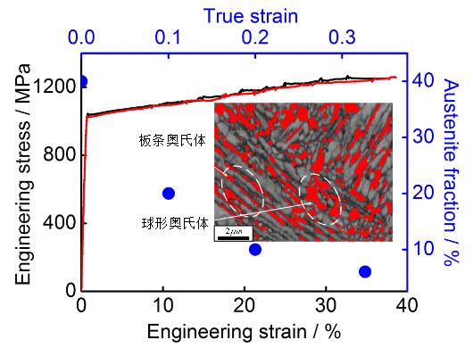 为满足节能减排和安全性的需求,汽车钢需要更高的强度。对于冷冲压成形,需要更高的延伸率满足其成形要求。对于热冲压成形,则需要保持强度的同时提高其延伸率,保证碰撞过程中的吸能。先进冷轧、热处理和涂镀工艺与装备技术方向杜鹏举硕士基于中锰的成分设计(3~10%Mn),受Q&P工艺中碳配分的启发,在中锰钢的基础上,提高其碳含量(0.2%以上),在逆相变中得到大量的残余奥氏体,以保证其强塑性。本研究创新的提出利用碳和锰的综合作用,冷轧板经短时退火后得到大量的残余奥氏体,开发了残余奥氏体和退火马氏体的双相、强塑积接近50GPa%的中锰TRIP钢。