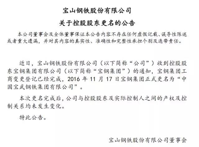 宝钢股份11月18日晚间公告,近日,公司收到控股股东宝钢集团有限公司的通知,宝钢集团工商变更登记已经完成,2016年11月17日宝钢集团正式更名为“中国宝武钢铁集团有限公司”。