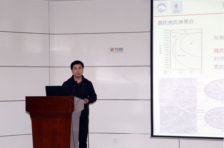 12月16日,我室2012级博士生宋红宇同学在RAL411学术报告厅作了留学期间研究工作专题汇报,详细汇报了他在加拿大McGill University留学期间的研究进展,包括薄带连铸取向硅钢中的魏氏奥氏体相变、初次再结晶影响高斯晶粒异常长大的机理、薄带连铸取向硅钢的二次再结晶行为等内容。此外,还介绍了钢铁材料和钛合金中的动态相变、晶体分析软件PTCLab在辅助标定透射衍射斑和研究极图上的应用等,同时还与我室师生分享了国外实验室在人才培养、设备使用、学术交流等方面的先进思想及经验。我室部分师生参会,并与宋红宇同学就汇报内容进行了讨论。