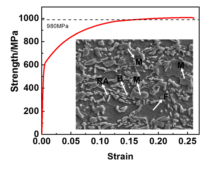 (1)本方向在Q&P钢理论研究和工业应用方面,提出了“马氏体+贝氏体协同碳配分”新概念与新工艺。在国际上首次基于企业传统连续退火生产线,在较低冷速与一步配分热处理条件下,开发成功强度980MPa级临界区淬火配分钢。成品板强塑积达到25GPa%,综合性能表现优异。