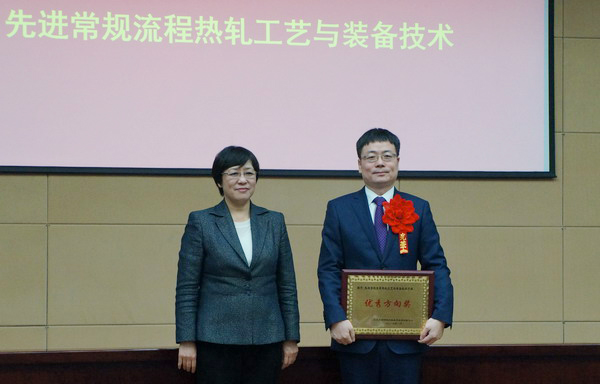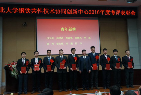 东北大学钢铁共性技术协同创新中心副主任吴迪教授宣读了“关于表彰2016年度中心新生入学奖、优秀研究生、优秀青年新秀、优秀创新标兵、优秀首席专家、优秀研究方向的决定”。根据中心年度工作计划,通过年度绩效考核,中心对李文远等10名硕士研究生、张元祥等20名博士研究生、付天亮等9名青年新秀、曹光明等11名创新标兵,优秀首席王昭东教授、韩跃新教授,优秀方向“先进常规流程热轧工艺与装备技术方向”予以表彰;同时,通过认定与考察,决定对彭飞等8名博士研究生、兰梦飞等47名硕士研究生颁发2016年度钢铁奖学金新生入学奖。颁奖结束后,优秀学生代表张元祥博士发表了获奖感言,并介绍了自己的学习方法和科研心得。优秀教师代表曹光明教授总结了一年来自己与课题组在新一代薄带连铸产线关键装备技术及产业化推广方面所取得的突破性成果,并号召全体师生继续发扬吃苦耐劳、不屈不挠的工作精神,扎扎实实推进相关研究工作,朝着既定目标稳步前进,为我国的绿色钢铁技术的发展作出努力与贡献。
