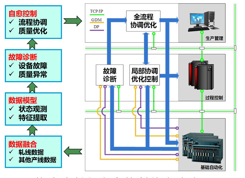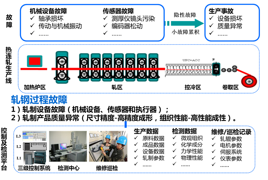 轧制生产具有速度快、变量参数多、高度衔接的多工序长流程等特点,隐性的、弱小故障会积累成大故障,设备故障和质量异常占到总停机时间的80%,严重影响产品质量和经济效益。受限于复杂工业流程的机理建模难、先验故障案例知识不完善和理论研究与实际联系不紧密等因素,所研究的设备故障对象单一且集中,对于流程系统质量故障、产品质量异常和预报后参数协调优化自愈控制研究较少,亟需解决轧制过程的故障诊断和自愈控制理论难题并投入实际应用。