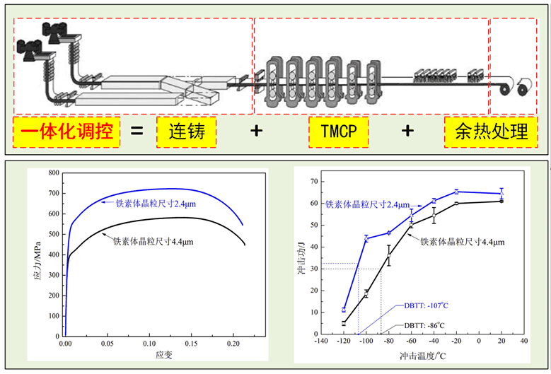 1)在经济型C-Mn系热轧钢工业化生产技术方面,将热轧双相钢的组织调控由“TMCP工艺调控”拓展至“连铸-TMCP-余热处理”一体化调控,以发挥热连轧线各工序的工艺潜力,提升热轧双相钢产品品质。