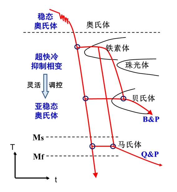 随着能源环境等问题的日益凸显,汽车工业正朝着减重降耗的方向发展。AHSS(先进高强度钢)在实现节能减排的同时,可充分满足汽车钢高强度的要求,成为汽车材料的重点研发对象。目前被称为第三代汽车用先进高强度Q&P(淬火-配分)钢的研究主要采取增加合金元素含量、离线热处理等方式来实现残余奥氏体的稳定控制,以期获得马氏体和5%~15%残余奥氏体的复相组织,实现强塑积大于20GPa.%的目标。然而,合金成本高、工序复杂等问题成为了制约其应用的关键因素。