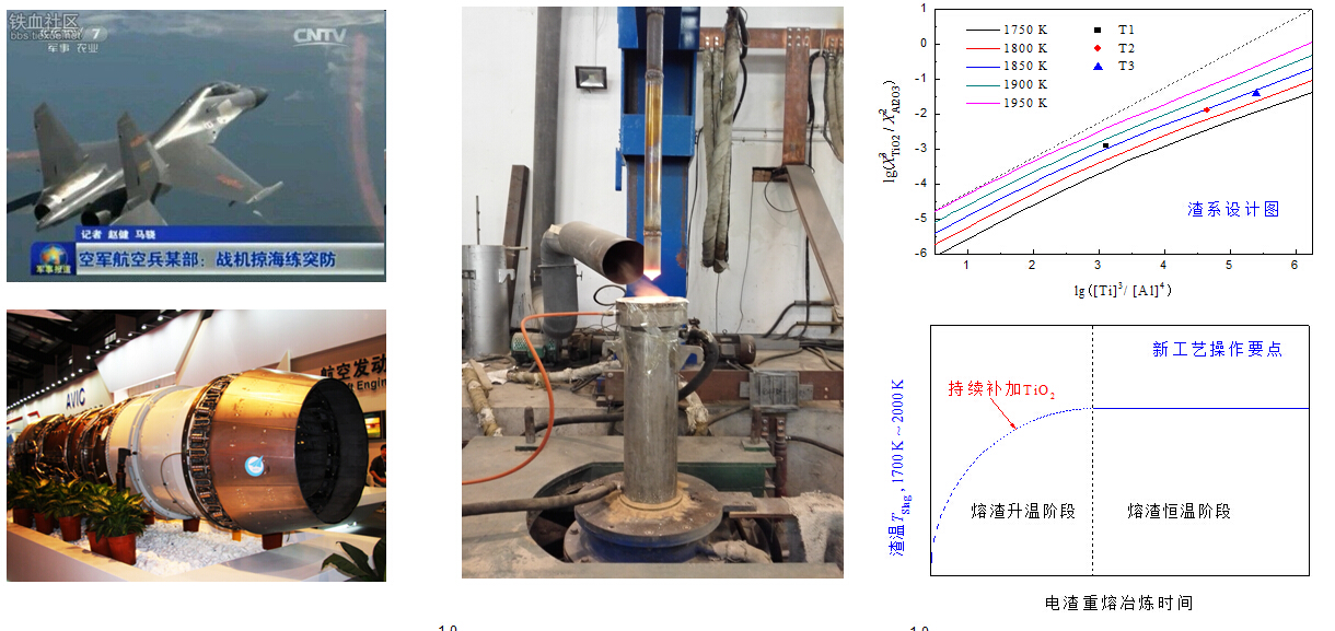 含铝钛的超级合金是广泛用于航空发动机、燃气轮机等高端领域的产品,于国家而言具有重要的战略意义。在该材料中的铝、钛是Ni3(Al, Ti)型强化相的主要形成元素,对提高合金的组织、性能起着重要的作用。电渣重熔作为该类合金的终端工艺,对铝、钛成分的均匀性控制起着直接的作用。然而重熔中伴随着渣温、外来氧势、炉渣组元与金属反应的非稳态变化,易造成电渣锭底部铝钛含量波动大,致使电渣锭报废,这是电渣领域的共性问题和研究热点。