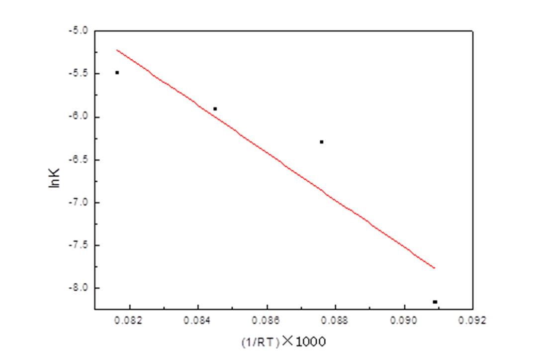 ▲图2 硼铁精矿动力学lnK-(1/RT)×1000线性拟合图