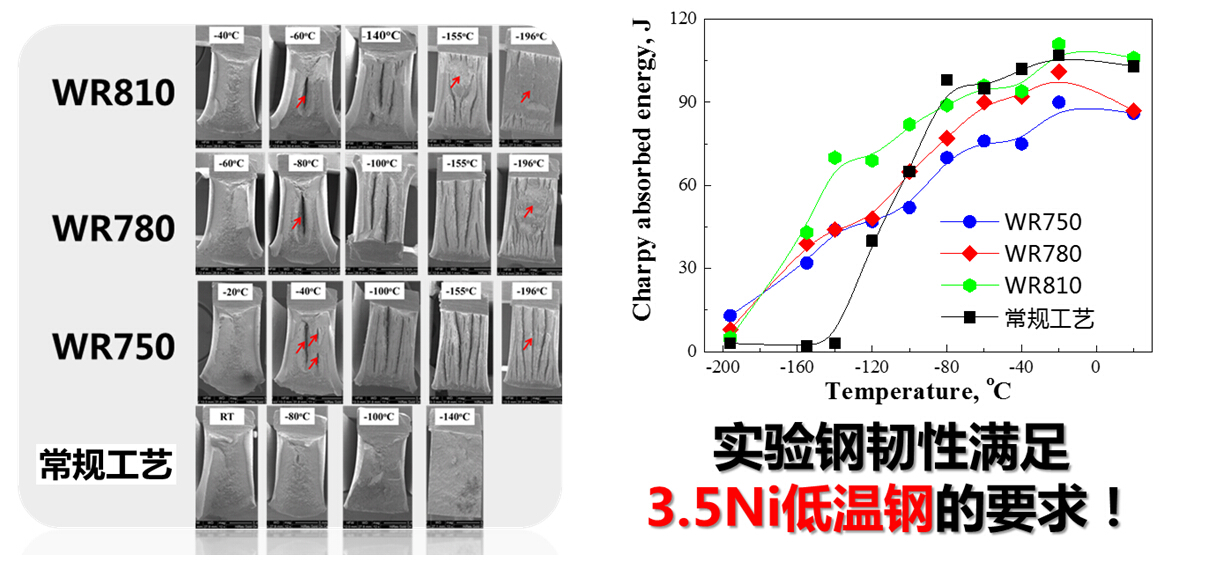 ▲“轧制-冷却”一体化工艺下的韧性及冲击断口
