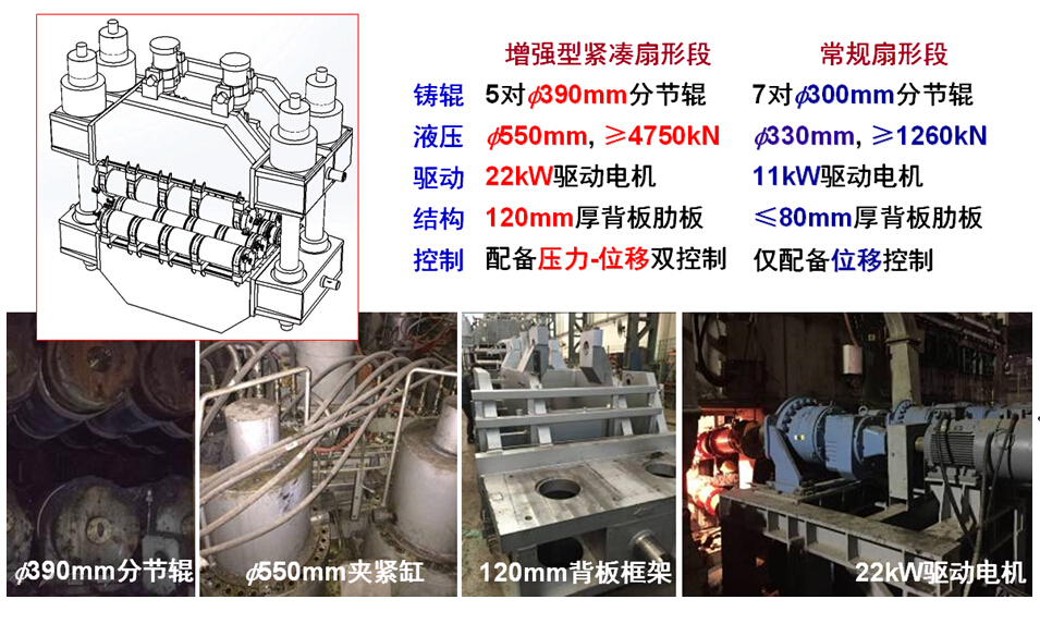 (1)设计开发了重压下核心装备—增强型紧凑扇形段,其在单位长度上压下能力较常规扇形段提升4倍以上,较浦项重压下扇形段提升1.6倍以上,实现了凝固末端单段压下16.5mm,多段压下40mm的突破,在国际上率先实现了全凝铸坯的连续大变形压下,全面保障了工艺的稳定实施。