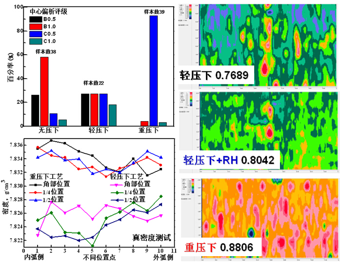 ▲增强型紧凑扇形段关键装备、铸坯低倍评级与真密度对比、铸坯中心区域致密度对比(原位分析)