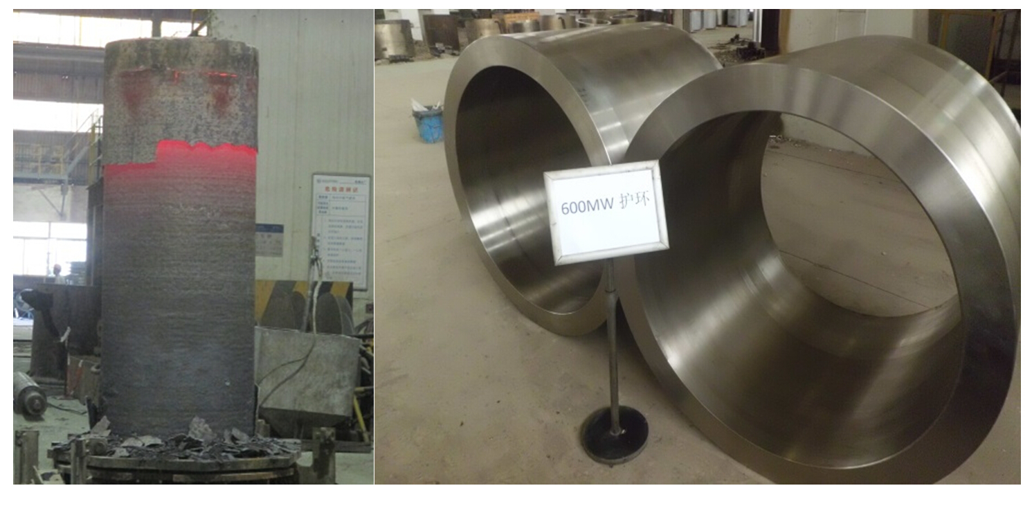 护环是汽轮发电机上关键受力部件,在高转速、高应力、腐蚀和强磁场的环境条件下工作,要求护环应具有高的强度,足够的塑性和韧性,优异的抗腐蚀性能和低的导磁性能。护环的高纯净度冶炼、锻造、热处理和冷变形强化工艺一直是行业公认的技术难题,核心制备技术长期被国外垄断,我国600MW以上大容量超超临界火电机组汽轮机护环全部依赖进口,价格昂贵且供货周期长。实现大容量护环国产化,对于保障我国能源工程项目建设安全和降低建设成本意义重大。