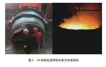 为验证钢包底喷粉元件的安全性和可行性,2015年,采用开发的钢包底喷粉元件和底喷粉新工艺装备,选择CaO基混合渣料粉作为脱硫剂,在2吨感应炉上进行了底喷粉脱硫精炼动力学热态试验,喷粉量为3kg/t时,平均脱硫率达70.3%。由于感应炉试验时炉容量小,再加上并未实行有效保护措施,钢液顶部形成了较大渣眼,影响了脱硫效率,而对于大工业规模钢包,钢液界面波动则会大大降低,而且在改进脱硫剂组分和喷吹参数后,钢液脱硫率可进一步提高,从而达到90%以上的脱硫目标。2016年,进一步完善了喷粉元件设计和工艺控制系统,成功实施了45吨工业级钢包底喷粉试验(图4),连续喷吹2炉没有发生钢包底部渗漏、管路堵塞、钢渣喷溅等现象,检验了底喷粉新工艺工业应用的可行性和可靠性,目前正在进行工业级的应用试验工作。