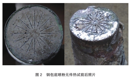 喷粉元件的材质决定了其使用寿命,因而材质选择至关重要。Al2O3-Cr2O3材料具有良好的高温性能,随氧化铬加入量增加,高温强度增加,但超过一定量时,高温强度则降低。加入氧化铬还能够提高透气砖抵抗钢渣的侵蚀能力,并且含铬制品随温度的升高,耐磨性增强。加入适量Cr2O3可以提高材料的高温抗折强度、耐侵蚀性、抗热震性、稳定性、抗冲刷性,延长透气砖使用寿命。此外,喷粉元件需长期经受粉气流冲刷,还要求具有更高的耐磨性。耐磨性取决于组成材料的矿物晶相的硬度,硬度越高,材质耐磨性越好,矿相为非同向晶体时,晶粒越细小,材料的耐磨性越好。为此,喷粉元件的制备基于传统钢包吹氩用透气砖制备工艺,仅需对其材质成分及生产工艺进行调整。底喷粉元件包括缝隙式底喷粉元件和蓄气室两部分构成,缝隙式底喷粉元件通过法兰连接螺栓与蓄气室连接,或者直接焊接在蓄气室上,底喷粉元件呈圆台状,外部包着金属壳,内部填充耐火材料,在耐材中均匀布置若干缝隙,缝隙贯穿耐火材料,耐火材料轴下端向外延伸出外锥形导流端。缝隙设计不仅决定着喷粉过程的安全性和可行性,而且对粉剂的喷入效率、喷吹过程稳定性以及透气砖寿命都有着重要影响,因此,缝隙参数是评价喷粉元件优劣的关键参数,对喷粉成败起着决定性作用,核心参数包括喷粉元件(图2)的芯内径、高度、缝隙宽度、缝隙长度、缝隙数目及缝隙布置方式等。通过实验室的冷喷、2吨感应炉热态试验以及45吨工业级钢包试验均取得了良好的使用效果。