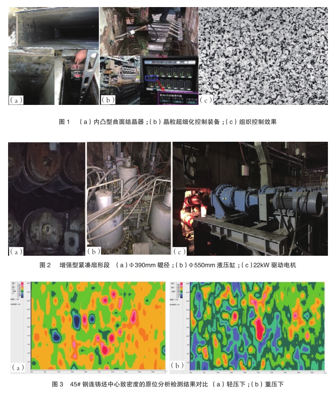 高致密度与均质度的连铸坯是突破传统轧制压缩比限定、直接生产特厚板和大规格型/棒材的前提和保障。连铸坯凝固末端重压下技术借助铸坯凝固末端内外温度梯度大的特点,通过在铸坯凝固末端实施大变形量,有效焊合凝固缩孔、改善中心疏松,是全面提升铸坯致密度的重要手段。东北大学结合宽厚板、大方坯连铸生产的具体特点,以精准压下、高效压下、有效压下、安全压下为目的,从理论研究、装备设计、工艺开发、控制技术集成等方面开发形成了具有自主知识产权的宽厚板连铸坯凝固末端重压下技术。2016年度,首次在唐钢中厚板公司实现了宽厚板连铸坯凝固末端重压下技术,成功实现轧制压缩比2.2:1条件下保探伤特厚板的制备;在大方坯连铸方面,进一步研发并成功实施了渐变曲率凸型辊压下技术,实现了凝固末端单辊压下15mm的突破,进一步提升了铸坯心部致密度。